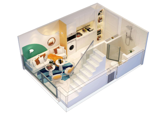 小空间大智慧,厨卫厅卧俱全,分区合理;4.2米挑高空间,买一层享两层,灵动随心;厅卧皆朝南,配备落地玻璃,舒享满屋阳光。