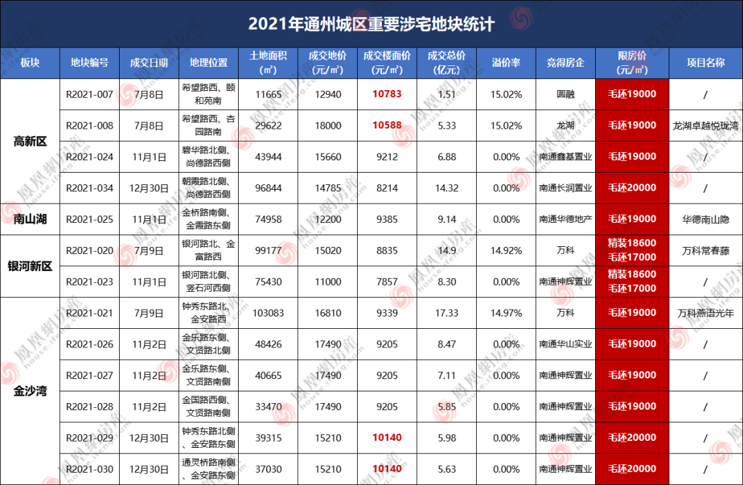 2021年南通进行了三轮集中供地,其中通州城区成功落锤13宗涉宅地,合计土地面积约73.36万方,具体分布为南山湖1宗、银河新区2宗、高新区4宗、金沙湾6宗。