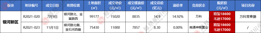 2宗地块都位于银河路北侧,东西相距约1.5公里,房价限制条件也相同:精装18600元/㎡,毛坯17000元/㎡。