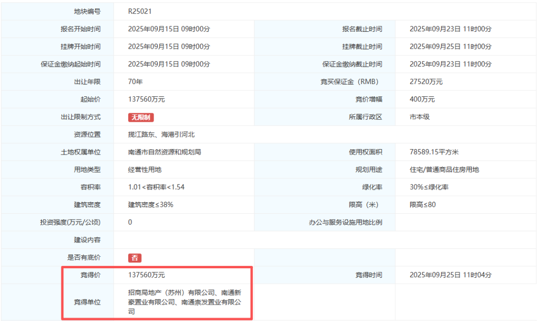 板块内两宗低密宅地成功出让,成交总金额超27亿元,占地面积合计超15万方,由招商蛇口、南通新豪置业、南通崇发置业联合摘牌。