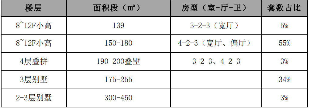 8-12层小高,建面约139-180㎡,套数占比60%