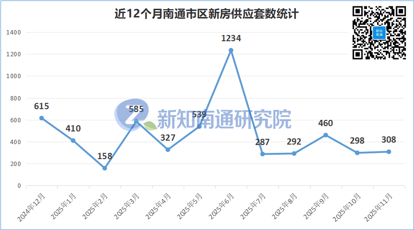 据「新知南通研究院」不完全统计,2025年11月,南通市区(包含崇川区、开发区、苏锡通园区,下同)新发住宅销售许可证7张,新增房源308套,供应量环比基本持平,但较去年同期下降约34%。